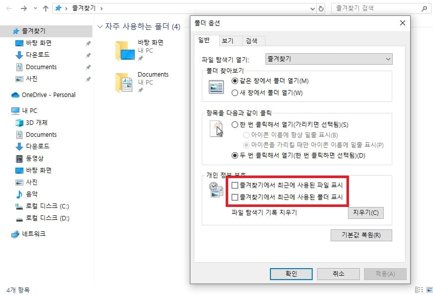 파일탐색기 최근에 사용한 파일 기록 삭제 및 표시 해제
