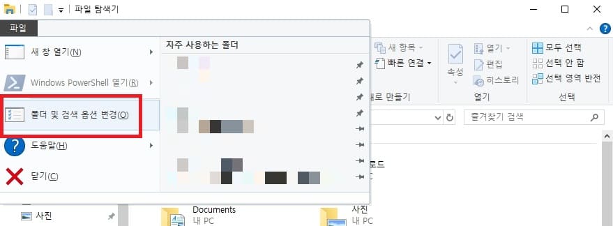 파일탐색기에서 왼쪽 파일 → 폴더 및 검색 옵션 변경 클릭합니다.